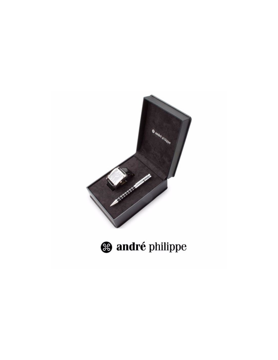 Juego de reloj con correa de piel y esfera metálica y bolígrafo de metal elegante. Presentación en caja exclusiva.