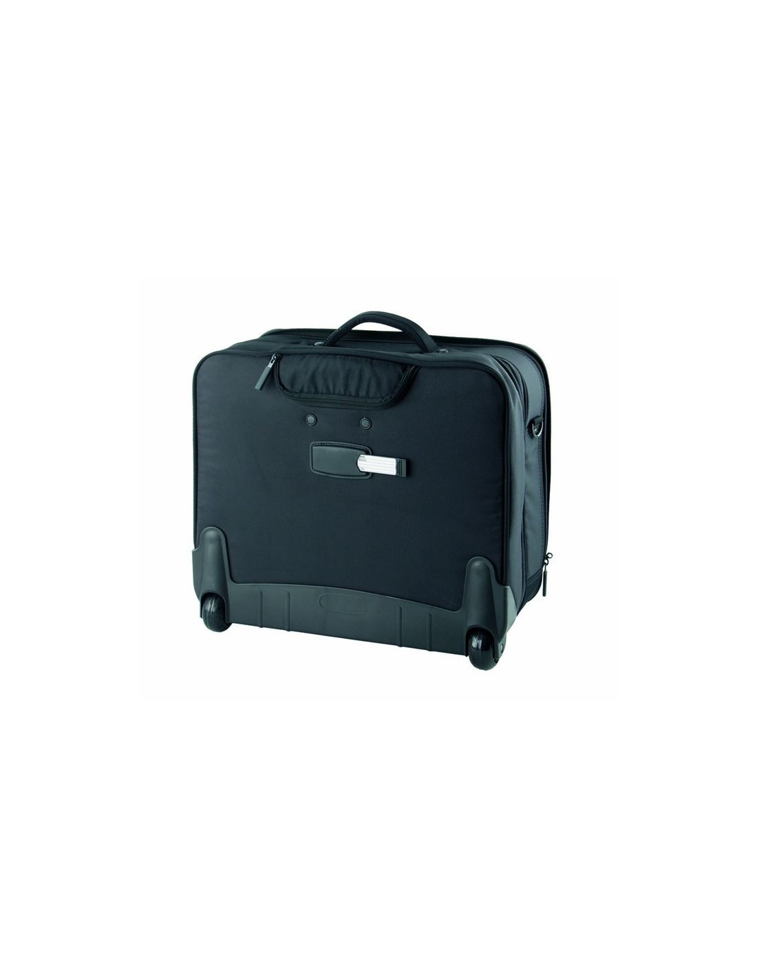 Maletín tipo trolley con 2 ruedas. Fabricado en polipiel de color negro. Con bolsillo acolchado.